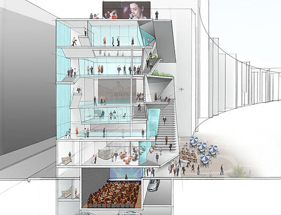 The promenade captures the key element of the beach—a space of the public in motion—on foot, bicycle and automobile. The building is conceived as an extension of that boulevard, stretched vertically into the museum.